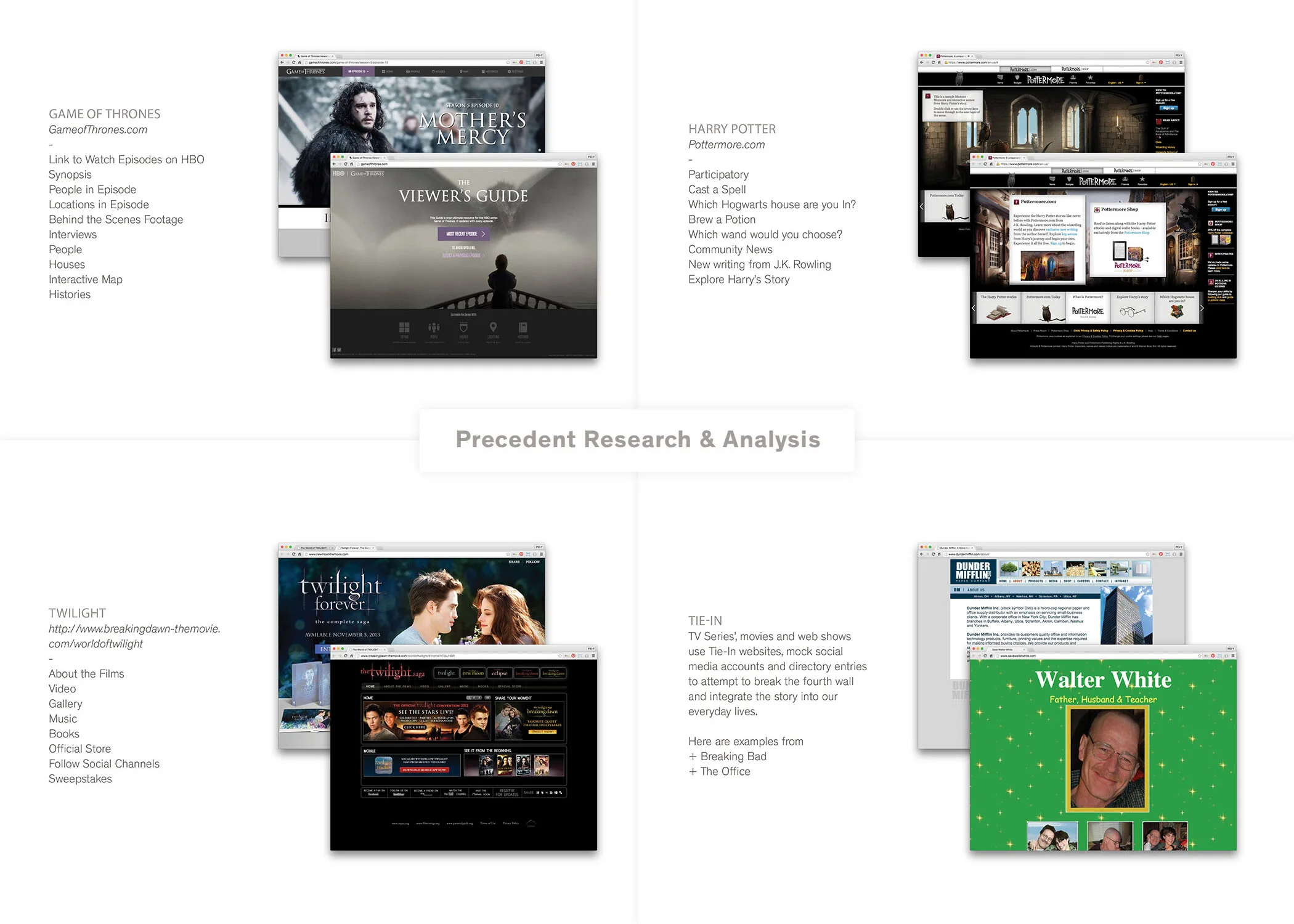 The discovery process kicked off with a thorough analysis of other media property interactives. These precedents highlighted an effective engagement tool—breaking the fourth wall to invite users and fans into the Shadowhunter’s universe.