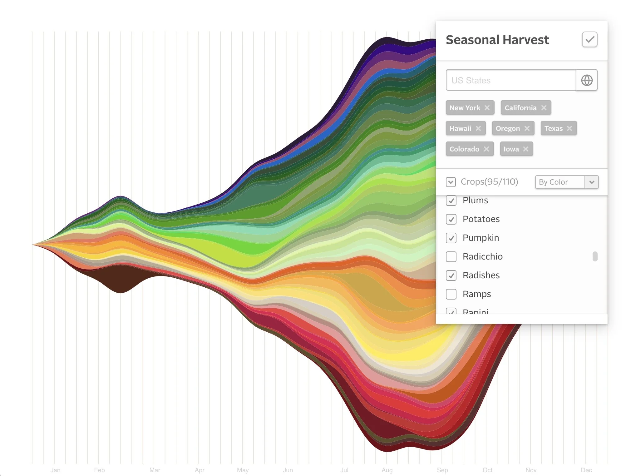 Using weekly crop harvest data reported by the USDA and NASS, along with supplemental crop season data from the NRDC and various state agricultural organizations, the weekly percentage of each crop’s full seasonal yield is visualized in a streamgraph that can be filtered by state and crop type.
